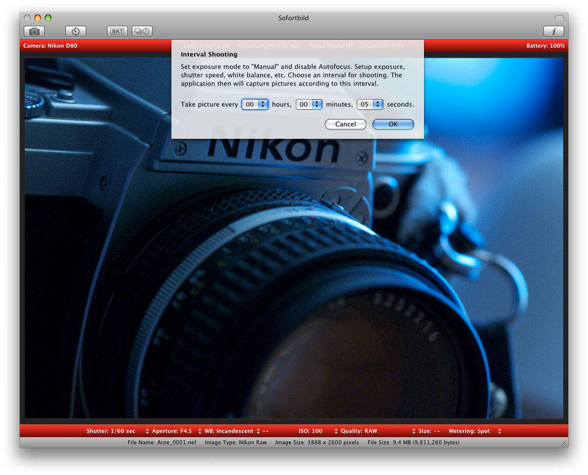 If you do use a battery, make sure that it is fully charged. If you intend to make a long time-lapse or if you are shooting via the computer I suggest you use an AC adapter for the camera: to keep it powered for an unlimited time. I almost always use an AC adapter when shooting time-lapse, it is more reliable then a battery. Moreover, some AC adapters allow the battery to remain in the camera so it will act as backup should the power fail.